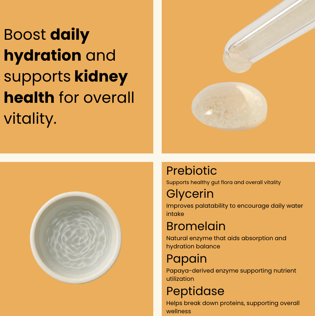 Every ingredient in our formula has a purpose, working with your cat’s biology to make water more appealing and support long-term hydration and kidney wellness.